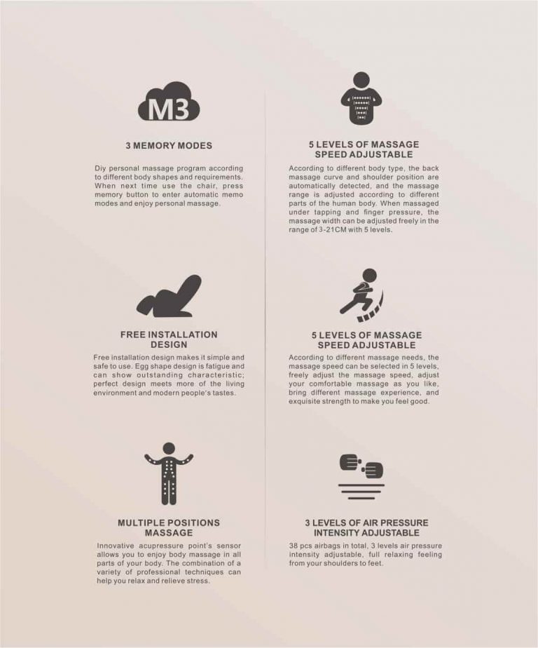 - 6 kinds of massage techniques: Kneading, Tapping, Shiatsu, Knocking,3D Massage and Kneading & tapping