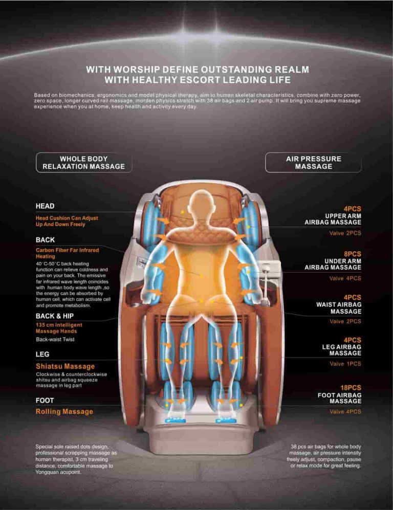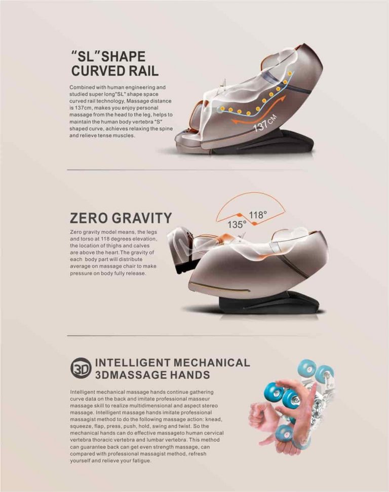 - Premium Zero Gravity massage chair equipped with a set of Intelligent 3D mechanical massage hand that can move up and down, front and rear.