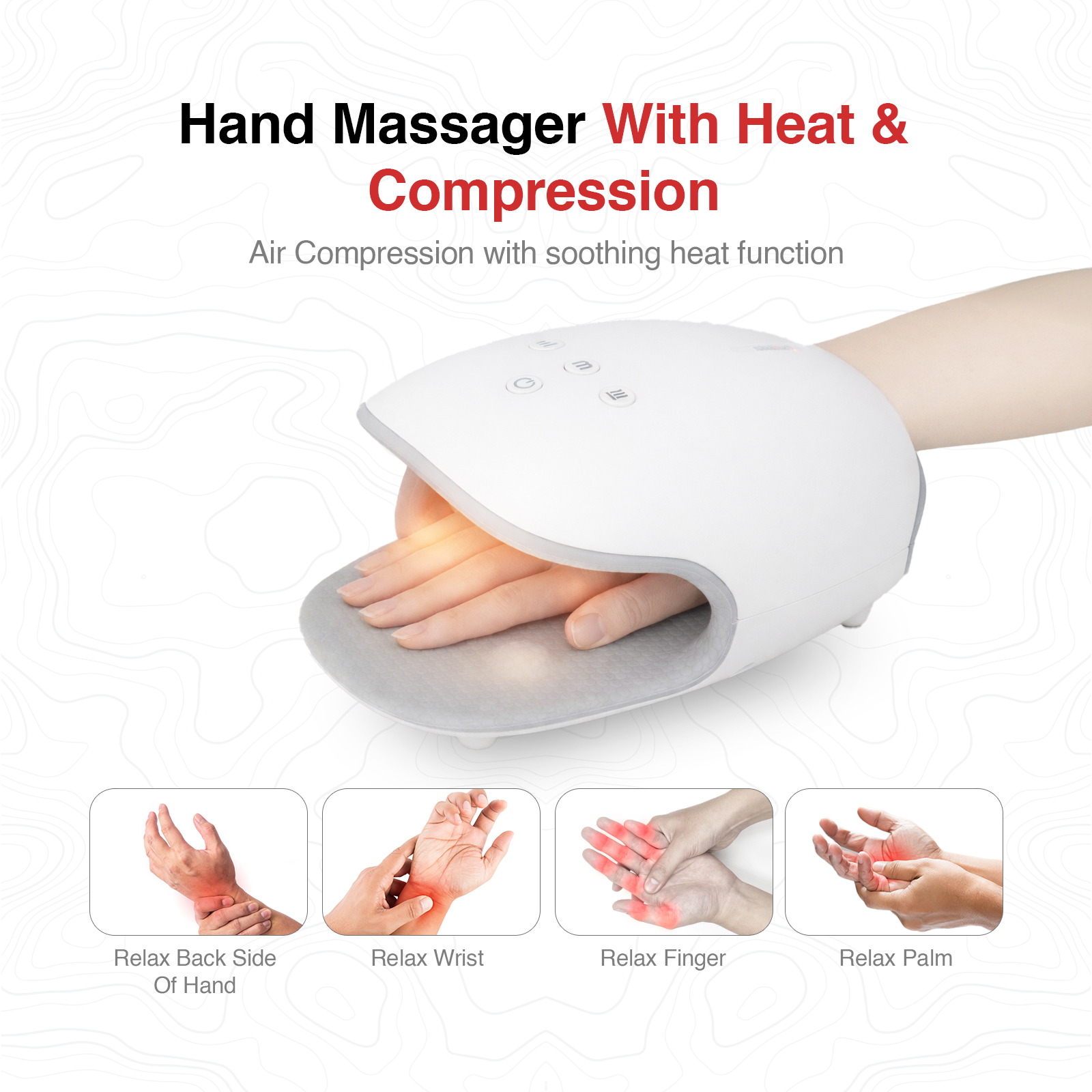Full-wrap air compression for palm & fingers3 massage modes + 3 air pressure levels2-level heating for enhanced comfort2500mAh rechargeable battery (Type-C)