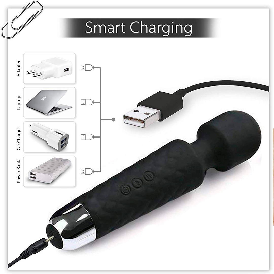 RoboTouch body wand massager is fully rechargeable and cordless. The charger has a USB port and plugs in the power cord in one and portable design makes it easy to carry